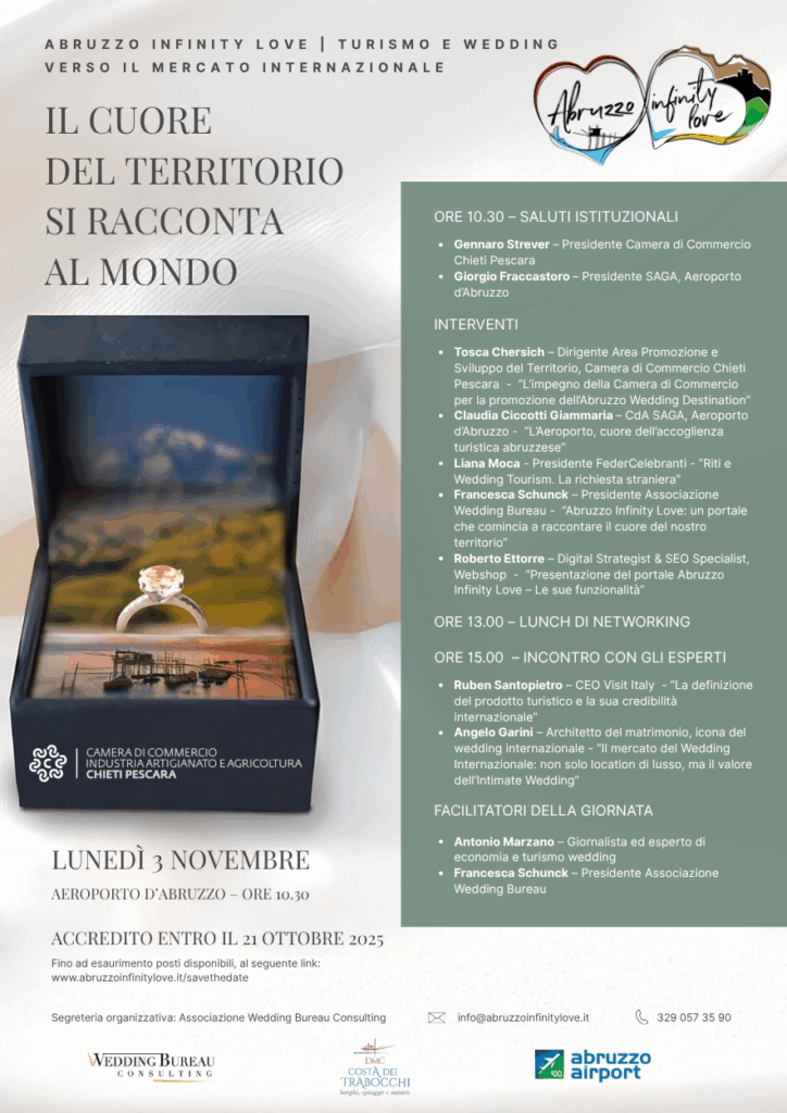 promosso dalla Camera di Commercio Chieti Pescara in collaborazione con Wedding Bureau Consulting. Un’iniziativa dedicata alla valorizzazione del turismo romantico e del wedding come leve strategiche per l’internazionalizzazione del territorio abruzzese. Un incontro che intreccia visione istituzionale, ispirazione creativa e strategie digitali, con ospiti di rilievo nazionale e internazionale.